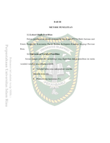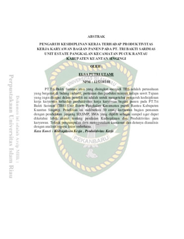 Utami, Elsa Putri (2018) Pengaruh Kesidiplinan Kerja Terhadap Produktivitas Kerja Karyawan Bagian Panen Pada Pt. Tri Bakti Sarimas Unit Estate Pangkalan Kecamatan Pucuk Rantau Kabupaten Kuantan Singingi. Other thesis, Universitas Islam Riau.