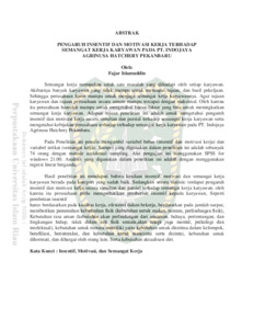 Semangat kerja mempakan salah satu masalah yang dihadapi oleh setiap karyawan. Akibatnya banyak karyawan yang tidak mampu untuk mencapai tujuan, dan basil pekeljaan. Sehingga perusahaan harus mampu untuk menjaga semangat kelja karyawannya. Agar tujuan karyawan dan tujuan perusahaan secara umum mampu tercapai dengan maksimal. Oleh karena itu perusahaan haruslah mampu untuk mengetahui faktor-faktor yang bisa untuk meningkatkan semangat kerja karyawan. Adapun tujuan penelitian ini adalah untuk mengetahui pengamh insentif dan motivasi kerja secara simultan dan parsial terhadap semangat kerja karyawan serta mengetahui kebijakan perusahaan terhadap terhadap semangat kerja karyawan pada PT. Indojaya Agrinusa Hatchery Pekanbaru. Pada Penelitian ini penulis mengambil variabel bebas (insentif dan motivasi kerja) dan variabel terikat (semangat kelja). Sampel yang digunakan dalam penelitian ini adalah sebanyak 74 orang dengan metode accidental sampling. Alat pengujian ini menggunakan SPSS for windows 21.00. Analisis yang digunakan dalam penelitian ini adalah dengan menggunakan regresi linear berganda. Hasil penelitian ini mendapati bahwa keadaan insentif, motivasi dan semangat kerja karyawan berada pada kategori yang sudah baik. Sedangkan secara statistic terdapat pengaruh insentif dan motivasi kelja secara simultan dan parsial terhadap semangat kerja karyawan. oleh karena itu perusahaan perlu memperhatikan pemberian insentif kepada karyawan, Seperti pembetian insentif harus berdasarkan pada kualitas kerja, efesiensi dalam bekerja, berdasarkan pada jumlah output, memberikan pemenuhan kebutuuhan fisik (kebutuhan untuk makan, minum, perlindungan fisik), Kebutuhan rasa aman (kebutuhan akan perlindungan dari ancaman, bahaya, pertentangan, dan lingkungan hidup, tidak dalam arti fisik semata,akan tetapi juga mental, psikologi dan intelektual), kebutuhan untuk merasa memiliki yaitu kebutuhan untuk diterima dalam kelompok, berafiliasi, berinteraksi, dan kebutuhan untuk mencintai serta dicintai, kebutuhan untuk dihormati, dan dihargai oleh orang lain. Serta kebutuhan aktualisasi diri.