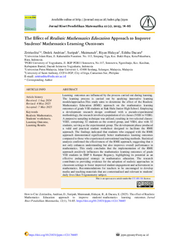 Zetriuslita, Zetriuslita and Andrian, Dedek and Suripah, Suripah and Maimunah, Maimunah and Hidayat, Riyan and Dacara, Editha (2025) The Effect of Realistic Mathematics Education Approach to Improve Students’ Mathematics Learning Outcomes. Jurnal Riset Pendidikan Matematika, 12 (1). pp. 74-85. ISSN 2477-1503