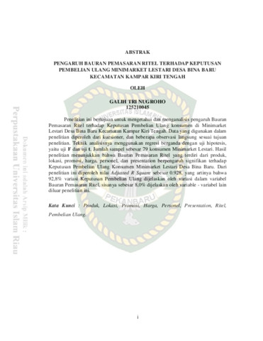 Nugroho, Galih Tri (2018) Pengaruh Bauran Pemasaran Ritel Terhadap Keputusan Pembelian Ulang Minimarket Lestari Desa Bina Baru Kecamatan Kampar Kiri Tengah. Other thesis, Universitas Islam Riau.