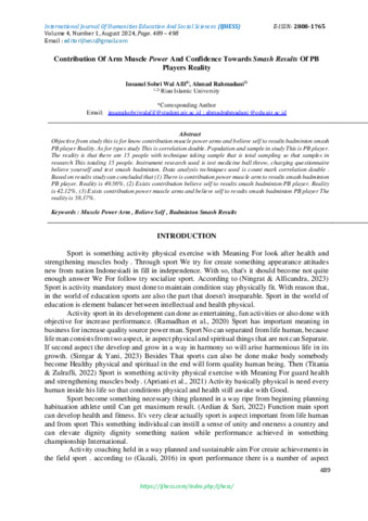 Afif, Insanul Sobri Wal and Rahmadani, Ahmad (2024) Contribution Of Arm Muscle Power And Confidence Towards Smash Results Of PB Players Reality. International Journal Of Humanities Education and Social Sciences, 4 (1). pp. 489-498. ISSN 2808-1765 (Unpublished)