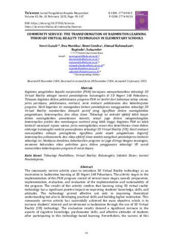 Gazali, Novri and Mustika, Dea and Cendra, Romi and Rahmadani, Ahmad and Rapindo, Rapindo and Sukaredo, Sukaredo (2025) Community Service: The Transformation of Badminton Learning Through Virtual Reality Technology in Elementary Schools. TA’AWUN, 5 (1). pp. 95-107. ISSN 2724-9150