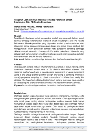 Pratama, Wahyu Putra and Rahmadani, Ahmad (2024) Pengaruh Latihan Sirkuit Training Terhadap Forehand Smash Bulutangkis Atlet PB Realita Pekanbaru. Catha : Journal ofCreative and Innovative Research, 1 (3). pp. 69-74. ISSN 3046-8760