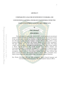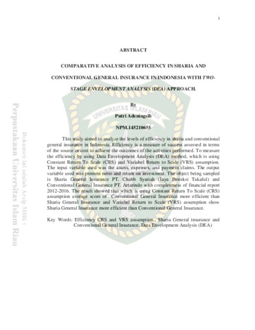 This study aimed to analyze the levels of efficiency in sharia and conventional general insurance in Indonesia. Efficiency is a measure of success assessed in terms of the source or cost to achieve the outcomes of the activities performed. To measure the efficiency by using Data Envelopment Analysis (DEA) method, which is using Constant Return To Scale (CRS) and Variabel Return to Scale (VRS) assumption. The input variable used was the assets, expenses, and payment claims. The output variable used was premmi netto and return on investment. The object being sampled is Sharia General Insurance PT. Chubb Syariah (Jaya Proteksi Takaful) and Conventional General Insurance PT. Artarindo with completeness of financial report 2012-2016. The result showed that which is using Constant Return To Scale (CRS) assumption average score of Conventional General Insurance more efficient than Sharia General Insurance and Variabel Return to Scale (VRS) assumption show Sharia General Insurance more efficient than Conventional General Insurance.
