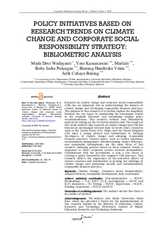 Devi Wedayanti, Made and Kusumawati, Yeni and Marliati, Marliati and Indra Pulungan, Boby and Hendriska Valen, Bintang and Cahaya Bening, Julik (2025) POLICY INITIATIVES BASED ON RESEARCH TRENDS ON CLIMATE CHANGE AND CORPORATE SOCIAL RESPONSIBILITY STRATEGY: BIBLIOMETRIC ANALYSIS. Virtus Interpress, 6 (3). pp. 8-16.