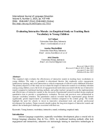 Yuliani, Sri and Mardatillah, Annisa and Linarta, Arie (2025) Evaluating Interactive Murals : An Empirical study on Teaching basic vocabulary to young children. International Journal of language education, 9 (2). pp. 437-448.