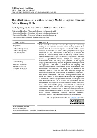 Rizqiani, Diyah Ayu and Yuliani, Sri and Roziah, Roziah and Putra, Al Malikul Ikhwanda (2024) The Effectiveness of A Critical Litercy Model to Improve Student' critical Literacy Skills. Al-Ishlah: Jurnal Pendidikan, 16 (2). pp. 1249-1260. ISSN 2087-9490