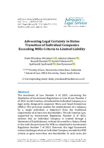 Wiriatma, Dodo Wiradana and Admiral, Admiral and Hamzah, Rosyidi and Febrianto, Surizki and Syafrinaldi, Syafrinaldi and Hyeonsoo, Kim (2025) Advocating Legal Certainty in Status Transition of Individual Companies Exceeding MSEs Criteria to Limited Liability. Indonesian Journal of Advocacy and Legal Services, 7 (1).