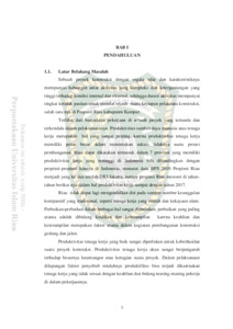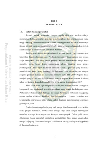 Sebuah proyek konstruksi dengan segala sifat dan karakteristiknya, mempunyai hubungan antar aktivitas yang kompleks dan ketergantungan yang tinggi terhadap kondisi internal dan ekternal sehingga durasi aktivitas mempunyai tingkat ketidakpastian yang tinggi untuk menilai sejauh mana kesiapan pelaksana konstruksi. Produktivitas tenaga kerja yang baik sangat diperlukan untuk keberhasilan suatu proyek kontruksi. Produktivitas tenaga kerja akan sangat berpengaruh terhadap besarnya keuntungan atau kerugian suatu proyek. Dalam pelaksanaan dilapangan hal tersebut terkadang bisa terjadi dikarenakan tenaga kerja yang tidak sesuai dengan keahlian dan bidang masing-masing pekerja di dalam pekerjaannya. Penelitian ini bertujuan untuk mengetahui faktor-faktor yang mempengaruhi Produktifitas Kerja Pada konstruksi Gedung studi kasus pembanguan gedung SMKN 1 Kuok Kab. Kampar-Riau. Tahapan penelitian ini adalah studi berbagai literatur yang ada untuk menentukan variabel yang akan digunakan. Tahap selanjutnya mendesain kuisioner penelitian kemudian melakukan pengambilan data. Pengambilan data dilakukan melalui penyebaran kuisioner kepada para tenaga kerja proyek konstruksi Gedung SMKN 1 Kuok Kab. Kampar-Riau. Data yang diperoleh dari kuisioner dijelaskan melalui analisis deskriptif dan untuk mengetahui pengaruh faktor-faktor yang mempengaruhi produktifitas tenaga kerja digunakan analisis regresi linear berganda. Hasil dari penelitian ini menunjukkan bahwa variabel independen usia (X1), pengalaman & hasil karya (X2), kondisi lapangan & sarana bantu (X3), keselamatan kerja (X4), kebijakan perusahaan (X5), kesesuaian upah (X6), dan karakterristik pekerja (X7) berpengaruh secara simultan terhadap variabel dependen produktifitas kerja (Y). Penelitian menunjukkan bahwa variabel kondisi lapangan & sarana bantu berpengaruh lebih dominan dibandingkan variabel lain.