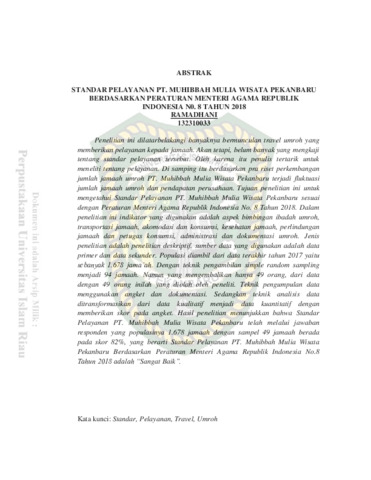 Penelitian ini dilatarbelakangi banyaknya bermunculan travel umroh yang memberikan pelayanan kepada jamaah. Akan tetapi, belum banyak yang mengkaji tentang standar pelayanan tersebut. Oleh karena itu penulis tertarik untuk meneliti tentang pelayanan. Di samping itu berdasarkan pra riset perkembangan jumlah jamaah umroh PT. Muhibbah Mulia Wisata Pekanbaru terjadi fluktuasi jumlah jamaah umroh dan pendapatan perusahaan. Tujuan penelitian ini untuk mengetahui Standar Pelayanan PT. Muhibbah Mulia Wisata Pekanbaru sesuai dengan Peraturan Menteri Agama Republik Indonesia No. 8 Tahun 2018. Dalam penelitian ini indikator yang digunakan adalah aspek bimbingan ibadah umroh, transportasi jamaah, akomodasi dan konsumsi, kesehatan jamaah, perlindungan jamaah dan petugas konsumsi, administrasi dan dokumentasi umroh. Jenis penelitian adalah penelitian deskriptif. sumber data yang digunakan adalah data primer dan data sekunder. Populasi diambil dari data terakhir tahun 2017 yaitu sebanyak 1.678 jama’ah. Dengan teknik pengambilan simple random sampling menjadi 94 jamaah. Namun yang mengembalikan hanya 49 orang, dari data dengan 49 orang inilah yang diolah oleh peneliti. Teknik pengumpulan data menggunakan angket dan dokumentasi. Sedangkan teknik analisis data ditransformasikan dari data kualitatif menjadi data kuantitatif dengan memberikan skor pada angket. Hasil penelitian menunjukkan bahwa Standar Pelayanan PT. Muhibbah Mulia Wisata Pekanbaru telah melalui jawaban responden yang populasinya 1.678 jamaah dengan sampel 49 jamaah berada pada skor 82%, yang berarti Standar Pelayanan PT. Muhibbah Mulia Wisata Pekanbaru Berdasarkan Peraturan Menteri Agama Republik Indonesia No.8 Tahun 2018 adalah “Sangat Baik”.
