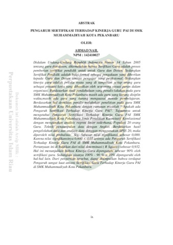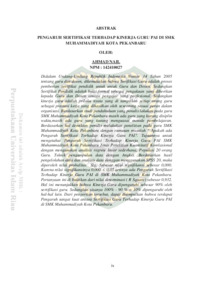 Didalam Undang-Undang Republik Indonesia Nomor 14 Tahun 2005 tentang guru dan dosen, dikemukakan bahwa Serifikasi Guru adalah proses pemberian sertifikat pendidik untuk untuk Guru dan Dosen. Sedangkan Sertifikat Pendidik adalah bukti formal sebagai pengakuan yang diberikan kepada Guru dan Dosen tenaga pengajar yang profesional. Sedangkan kinerja guru adalah prilaku nyata yang di tampilkan setiap orang guru sebagai prestasi kerja yang dihasilkan oleh seseorang sesuai peran dalam organisasi. Berdasarkan studi pendahuluan yang penulis lakukan pada guru SMK Muhammadiyah Kota Pekanbaru masih ada guru yang kurang disiplin waktu,masih ada guru yang kurang menguasai metode pembelajaran. Berdasarkan hal demikian penulis melakukan penelitian pada guru SMK Muhammadiyah Kota Pekanbaru dengan rumusan masalah “ Apakah ada Pengaruh Sertifikasi Terhadap Kinerja Guru PAI?. Tujuannya untuk mengetahui Pengaruh Sertifikasi Terhadap Kinerja Guru PAI SMK Muhammadiyah Kota Pekanbaru Jenis Penelitian Kuantitatif Korelasional dengan mengunakan analisis regresi linier sederhana, Populasi 20 orang Guru. Teknik pengumpulan data dengan Angket. Berdasarkan hasil pengelolahan data dan analisis data denggan menggunakan SPSS 20, maka diperoleh nilai probalitas Sig. Sebesar nilai signifikansi sebesar 0,000. Karena nilai signifikansinya 0,000 < 0,05 artinya ada Pengaruh Sertifikasi Terhadap Kinerja Guru PAI di SMK Muhammadiyah Kota Pekanbaru. Pertanyaan ini di buktikan dari nilai determinasi ( R Square ) sebesar 0,932. Hal ini menunjukkan bahwa Kinerja Guru dipengaruhi sebesar 90% oleh sertifikasi guru. Sedangkan sisanya 100% - 90 % = 10% dipengaruhi oleh hal-hal lain. Dari pengertian tersebut, dapat disimpulkan bahwa terdapat Pengaruh sangat kuat antara Sertifikasi Guru Terhadap Kinerja Guru PAI di SMK Muhammadiyah Kota Pekanbaru.