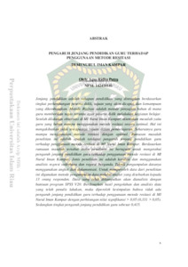 Jenjang pendidikan adalah tahapan pendidikan yang ditetapkan berdasarkan tingkat perkembangan peserta didik, tujuan yang akan dicapai, dan kemampuan yang dikembangkan. Metode Resitasi adalah metode penyajian bahan di mana guru memberikan tugas tertentu agar peserta didik melakukan kegiatan belajar. Setelah dilakukan observasi di MI Nurul Iman Kampar, ditemukan masalah yaitu guru yang belum mampu menggunakan metode resitasi secara optimal. Hal ini mengakibatkan tidak tercapainya tujuan dalam pembelajaran. Seharusnya guru mampu menggunakan metode resitasi dengan optimal. Rumusan masalah penelitian ini adalah apakah terdapat pengaruh jenjang pendidikan guru terhadap penggunaan metode resitasi di MI Nurul Iman Kampar. Berdasarkan rumusan masalah tersebut maka penelitian ini bertujuan untuk mengetahui pengaruh jenjang pendidikan guru terhadap penggunaan metode resitasi di MI Nurul Iman Kampar. Jenis penelitian ini adalah korelasi dan menggunakan analisis regresi sederhana dan regresi berganda. Teknik pengumpulan datanya menggunakan angket dan dokumentasi. Untuk memperoleh data dari penelitian ini digunakan metode pengumpulan data melalui angket yang disebarkan kepada 13 orang responden. Data yang telah dikumpulkan akan dianalisis dengan bantuan program SPSS V20. Berdasarkan hasil pengolahan dan analisis data yang telah penulis lakukan, maka diperoleh kesimpulan bahwa tidak ada pengaruh jenjang pendidikan guru terhadap penggunaan metode resitasi di MI Nurul Iman Kampar dengan perhitungan nilai signifikansi > 0,05 (0,331 > 0,05). Sedangkan tingkat pengaruh jenjang pendidikan guru sebesar 0,415.