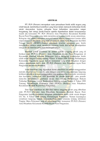 PT. PLN (Persero) merupakan suatu perusahaan listrik milik negara yang telah banyak memberikan kontribusi yang besar dalam memasok kebutuhan listrik untuk masyarakat, karena sebagian besar kebutuhan masyarakat sangat bergantung dari energi listrik.Namun apabila diperhatikan dalam kenyataannya masih ada konsumen PT. PLN (Persero) Area Pekanbaru Kecamatan Rambah Rayon Pasir Pengaraian yang tidak menerima pelayanan listrik secara semestinya. Kerugian dari pihak konsumen mengakibatkan adanya wanprestasi karena tidak terpenuhinya isi perjanjian yang telah di sepakati dalam Surat Perjanjian Jual Beli Tenaga Listrik (SPJBTL).Dalam perjanjian tersebut pengguna jasa listrik mengikatkan dirinya untuk membayar rekening listrik dan berhak mendapatkan tenaga listrik dan/atau pelayanan ketenagalistrikan. Masalah pokok penelitian ini adalah apakah tanggung jawab yang di berikan oleh PT.PLN (Persero) Area Pekanbaru Rayon Pasir Pengaraian di Kecamatan Rambah terhadap Pelanggan Listrik mengenai pemadaman listrik telah sesuai dengan Undang-undang Nomor 8 Tahun 1999 Tentang Perlindungan Konsumen, bagaimana upaya hukum konsumen yang telah dirugikan dengan adanya pemadaman listrik oleh PT.PLN (Persero) Area Pekanbaru rayon Pasir Pengaraian Kecamatan Rambah. Jenis penelitian yang digunakan dalam penelitian ini adalah menggunakan metode observational research, yaitu dengan cara survey atau meninjau langsung kelokasi penelitian dengan menggunakan alat pengumpulan data yaitu wawancara dan kuesioner. Sedangkan sifat penelitian ini adalah deskriptif, yaitu penulis mencoba memeberikan gambaran secara rinci tentang Perlindungan Hukum Terhadap Pelanggan Listrik Berdasarkan Undang-undang Nomor 8 Tahun 1999 Tentang Perlindungan Konsumen Oleh PT.PLN (Persero) Area Pekanbaru Kecamatan Rambah Rayon Pasir Pangaraian. Dari hasil penelitian ini diketahui bahwa tanggung jawab yang diberikan oleh PT.PLN (Persero) Area Pekanbaru Kecamatan Rambah Rayon Pasir Pengaraian kepada konsumen mengenai pemadaman listrik telah sesuai dengan UU No. 8 Tahun 1999 tentang Perlindungan Konsumen. Namun kuarangnya sosialisasi langsung kepada masyarakat/konsumen terutama tentang informasi Tingkat Mutu Pelayanan yang di peruntukan bagi konsumen PT.PLN (Persero) Area Pekanbaru Kecamatan Rambah Rayon Pasir Pengaraian.