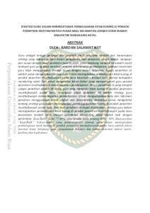 Guru sebagai tenaga pengajar dan pendidik mesti berusaha memilih dan menemukan strategi yang relevan dengan materi pengajaran, alat pelajaran, situasi belajar mengajar dan sesuai dengan taraf pemikiran peserta didik. Latar belakang masalah ini adalah masih terdapat guru yang tidak membuat rencana pelaksanaan pembelajaran, terdapat masih ada guru tidak menggunakan strategi sesuai dengan materi pelajaran. Tujuan penelitian ini adalah untuk mengetahaui strategi guru dalam meningkatkan pembelajaran kitab kuning di pondok pesantren musthafawiyah purba baru kecamatan lembah sorik marapi kabupaten mandailing natal. Dan untuk mengetahui faktor-faktor yang mempengaruhi guru pondok pesantren musthafawiyah dalam kegiatan pembelajaran. Dalam penelitian ini yang menjadi subyek penelitian adalah 38 orang guru yang mengajar kitab kuning di pondok pesantren musthafawiyah purba baru, sedangkan objek penelitian ini adalah strategi guru musthafawiyah dalam kegiatan pembelajaran. Untuk mengumpulkan data dan informasi penulisan menggunakan teknik angket dan dokumentasi. Kemudian untuk mengetahui tentang strategi guru dalam meningkatkan pembelajaran kitab kuning di pondok pesantren musthafawiyah purba baru. Dan hasil penulisan ini dapat disimpulkan: strategi guru dalam meningkatkan pembelajaran kitab kuning di pondok pesantren musthafawiyah purba baru kecamatan lembah sorik marapi kabupaten mandailing natal adalah baik dengan persentase Kuat/Baik” yakni 77.64%, atau berada pada rentang 61% - 80% dikategorikan “Kuat/Baik”. Faktor-faktor yang mempengaruhi strategi guru dalam meningkatkan pembelajaran kitab kuning di pondok pesantren musthafawuyah purba baru adalah faktor internal (latar belakang guru, pengalaman belajar) dan faktor eksternal (faktor santri, fasilitas dan kurikulum).