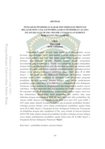 Pendidikan karakter adalah suatu usaha yang direncanakan secara bersama yang bertujuan untuk menciptakan generasi penerus yang memiliki dasar-dasar pribadi yang baik, baik dalam pengetahuan (kognitif), perasaan (feeling), dan tindakan (action). Prestasi belajar adalah penguasaan keterampilan yang dikembangkan melalui mata pelajaran, lazimnya ditunjukkan dengan nilai yang diberikan oleh guru. Berdasarkan hal demikian rumusan pada penelitian ini adalah apakah ada pengaruh pendidikan karakter terhadap prestasi belajar siswa dalam pembelajaran pendidikan agama Islam kelas XI di SMA Negeri 1 Pangkalan Kerinci Kabupaten Pelalawan. Berdasarkan rumusan masalah tersebut maka penelitian ini bertujuan untuk mengetahui pengaruh pendidikan karakter terhadap prestasi belajar siswa dalam pembelajaran pendidikan agama Islam kelas XI di SMA Negeri 1 Pangkalan Kerinci Kabupaten Pelalawan. Jenis penelitian ini adalah korelasi dan menggunakan analisis regresi sederhana. Untuk memperoleh data dari penelitian ini diambil sampel sebanyak 80 responden dan teknik pengumpulan datanya menggunakan angket, observasi dan dokumentasi. Berdasarkan hasil pengolahan dan analisis data yang dilakukan dengan menggunakan SPSS 20, maka diperoleh nilai probabilitas Sig sebesar 0,000. Karena nilai signifikansinya lebih kecil dari 0,05 yaitu 0,000 < 0,05 maka dapat diambil kesimpulan bahwa ada pengaruh pendidikan karakter terhadap prestasi belajar siswa dalam pembelajaran pendidikan agama Islam kelas XI di SMA Negeri 1 Pangkalan Kerinci Kabupaten Pelalawan. Pernyataan ini dibuktikan dengan nilai signifikansi 0,744, yang terletak di interval koefisien 0,60-0,799 maka tingkat pengaruh pendidikan karakter terhadap prestasi belajar siswa dalam pembelajaran pendidikan agama Islam kelas XI di SMA Negeri 1 Pangkalan Kerinci Kabupaten Pelalawan “Kuat”.