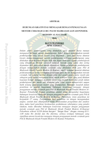 Frandoko, Klyn (2018) Hubungan Krativitas Mengajar Dengan Penggunaan Metode Ceramah Guru Pai Di Madrasah Aliyah Pondok Modern Al-Kautsar. Other thesis, Universitas Islam Riau.