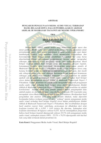 Media Audio Visual adalah media yang mempunyai unsur suara dan unsur gambar. Media audio visual adalah media perantara yang digunakan untuk penyampaian materi baik secara pandangan maupun pendengaran agar dapat membangun kondisi yang membuat siswa memperoleh pengetahuan dan keterampilan. Hasil belajar dalam pendidikan merupakan hal yang harus diperhatikan dalam pelaksanaan pembelajaran karena untuk mengetahui seberapa jauh seorang siswa menguasai bahan yang sudah diajarkan. Hasil belajar kognitif adalah hasil belajar yang ada kaitannya dengan ingatan, kemampuan berpikir atau intelektual. Berdasarkan pengamatan penulis di Madrasah Tsanawiyah Negeri 3 Pekanbaru masih adanya sebagian siswa yang kurang berminat untuk merespon pertanyaan-pertanyaan dari guru, dan masih ada sebagian siswa yang hasil ulangan hariannya belum mencapai ketuntasan sehingga guru memberikan remedial. Rumusan masalah penelitian ini adalah apakah ada pengaruh penggunaan media audio visual terhadap hasil belajar siswa dalam pembelajaran Akidah Akhlak di Madrasah Tsanawiyah Negeri 3 Pekanbaru. Tujuan penelitian ini adalah untuk mengetahui pengaruh penggunaan media audio visual terhadap hasil belajar siswa dalam pembelajaran Akidah Akhlak di Madrasah Tsanawiyah Negeri 3 Pekanbaru. Jenis penelitian ini adalah korelasional. Adapun teknik yang penulis gunakan dalam pengumpulan data adalah angket, tes dan dokumentasi yang disebarkan kepada 180 responden yang merupakan siswa Madrasah Tsanawiyah Negeri 3 Pekanbaru. Berdasarkan hasil pengolahan dan analisis data yang telah penulis lakukan, maka diperoleh kesimpulan bahwa terdapat pengaruh yang “sedang” antara penggunaan media audio visual terhadap hasil belajar kognitif siswa dalam pembelajaran Akidah Akhlak di Madrasah Tsanawiyah Negeri 3 Pekanbaru. Hal ini dibuktikan dengan hasil analisis regresi linier sederhana, pernyataan ini dibuktikan dari nilai koefisien korelasi (R) = 0,505 > 0,05 artinya Ha diterima, Sedangkan nilai koefisien determinasi (R Square) sebesar 0,255. hal ini menunjukkan pengertian bahwa hasil belajar kognitif dipengaruhi sebesar 25,5% oleh penggunaan media audio visual, sedangkan sisanya 100% - 25,5% = 74,5% dipengaruhi oleh hal-hal lain yang tidak termasuk dalam penelitian ini.