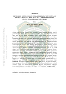 Metode Demonstrasi adalah cara mengajar dengan mempertunjukan materi pembelajaran diikuti dengan penampilan tingkah laku yang dicontohkan oleh guru dan peserta didik menirukan secara nyata agar mereka memiliki pemahaman dan keterampilan maksimal sesuai dengan indikator dan tujuan pembelajaran yang telah ditentukan. Konsentrasi adalah pemusatan tenaga dan energi psikis dalam menghadapi suatu objek, dalam hal ini peristiwa proses belajar mengajar di kelas dan apa yang berkaitan dengan itu. Berdasarkan studi pendahuluan yang penulis lakukan di SD Negeri 048 Pekanbaru, bahwa yang mengakibatkan peserta didik kurang berkonsentrasi ketika belajar adalah suasana lingkungan yang kurang kondusif yakni letak sekolah yang terlalu dekat dengan jalan raya. Penulis melakukan penelitian pada peserta didik kls IV di SD Negeri 048 Pekanbaru dengan rumusan masalah “Apakah ada Pengaruh Metode Demonstrasi terhadap konsentrasi belajar peserta didik dalam pelajaran Pendidikan Agama Islam?. Tujuannya untuk mengetahui pengaruh Metode Demonstrasi terhadap konsentrasi belajar peserta didik di kls IV SD Negeri 048 Pekanbaru. Metode penelitian korelasi, populasi sebanyak 78 responden. Metode penelitian menggunakan jenis kuantitatif. Berdasarkan Hasil uji_t diperoleh bahwa thitung sebesar 1.321 dengan nilai ttabel 1.99167, maka diketahui nilai thitung (1.321)< ttabel (1.99167)menunjukkan variabel Metode Demonstrasi “Ada pengaruh” terhadap Konstrasi Belajar peserta didik kls IV SD 048 Pekanbaru. Besar pengaruh Metode Demonstrasi pada nilai R_Square/koefesien determinasi sebesar 0.022, ini menunjukkan pengaruh Metode Demonstrasi terhadap konsentrasi belajar peserta didik di SD Negeri 048 Pekanbaru “ sangat rendah”.