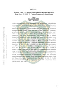 Strategi dapat diartikan sebagai suatu upaya yang dilakukan oleh seseorang atau organisasi untuk sampai pada tujuan. Dalam Kamus Besar Bahasa Indonesia, strategi adalah rencana yang cermat mengenai kegiatan untuk mencapai sasaran khusus yang diinginkan. Pendidikan karakter merupakan suatu sistem penanaman nilai-nilai karakter kepada peserta didik yang meliputi komponen : kesadaran, pemahaman, kepedulian dan komitmen yang tinggi untuk melaksanakan nilainilai tersebut, baik terhadap Tuhan Yang Maha Esa, diri sendiri, sesama, lingkungan. Akan tetapi permasalahannya yang terjadi di SMP IT Pondok Pesantern Syahruddiniah masih ada guru yang kurang memperhatikan serta menasehati siswa yang berkelahi, masih ada ada guru yang belum dapat menjadi tauladan contoh guru terlambat masuk kelas. Rumusan masalah penelitian ini adalah bagaimana Strategi Guru PAI Dalam Menerapkan Pendidikan Karakter Bagi Siswa di SMP IT Pondok Pesantern Syahruddiniah. Berdasarkan rumusan masalah ini tersebut, maka penelitian ini bertujuan untuk mengetahui Strategi Guru PAI Dalam Menerapkan Pendidiksn Karakter Bagi Siswa di SMP IT Pondok Pesantern Syahruddiniah. Jenis penelitian ini adalah penelitian lapangan yang bersifat deskriptif kualitatif,Teknik pengumpulan datanya menggunakan observasi dan dokumentasi.Untuk memperoleh data dari penelitian ini digunakan metode pengumpulan data melalui observasi kepada 1 orang guru. Data yang telah dikumpulkan akan dianalisi dan di ambil kesimpulan bahwa Strategi Guru PAI Dalam Menerapkan Pendidikan Krakter Bagi Siswa di SMP IT Pondok Pesantern Syahruddiniah Baik, dengan persentase 78% yang terletak pada rentang antara 76% - 100%.