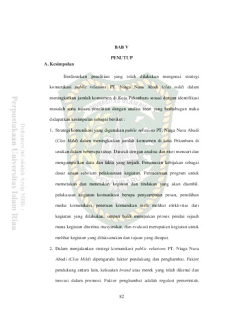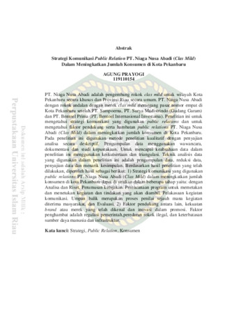 Prayogi, Agung (2018) Strategi Komunikasi Public Relation PT. Niaga Nusa Abadi (Clas Mild) Dalam Meningkatkan Jumlah Konsumen di Kota Pekanbaru. Other thesis, Universitas Islam Riau.