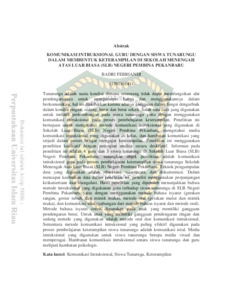 Tunarungu adalah suatu kondisi dimana seseorang tidak dapat memfungsikan alat pendengarannya untuk mempersepsi bunyi dan menggunakannya dalam berkomunikasi, hal ini diakibatkan karena adanya gangguan dalam fungsi dengarbaik dalam kondisi ringan, sedang, berat dan berat sekali. Salah satu cara yang digunakan untuk melatih perkembangan pada siswa tunarungu yaitu dengan menggunakan komunikasi intruksional pada proses pembelajaran keterampilan. Penelitian ini bertujuan untuk mengetahui metode komunikasi intruksional yang digunakan di Sekolah Luar Biasa (SLB) Negeri Pembina Pekanbaru, mengetahui media komunikasi intruksional yang digunakan di kelas, dan hambatan komunikasi yang terjadi dalam proses belajar mengajar keterampilan. Penelitian ini menggunakan penelitian kualitatif dengan penyajian analisa secara deskriptif. Informan pada penelitian ini adalah 4 guru dan 3 siswa tunarungu di Sekolah Luar Biasa (SLB) Negeri Pembina Pekanbaru, sedangkan objek penelitian adalah komunikasi intruksional guru pada proses pembelajaran keterampilan siswa tunarungu Sekolah Menengah AtasLuar Biasa (SLB) Negeri Pembina Pekanbaru. Teknok pengumpulan data yang digunakan adalah observasi, wawancara, dan dokumentasi. Dalam mencapai keabsahan data dalam penelitian ini, peneliti menggunakan perpanjangan ke ikutsertaan dan triangulasi.Hasil penelitian yang diperoleh menunjukkan bahwa metode intruksional yang digukanan guru terhadap siswa tunarungu di SLB Negeri Pembina Pekanbaru yaitu dengan menggunakan metode bahasa isyarat (gerakan tangan, gestur tubuh, dan mimik muka), metode oral (gerakan mulut dan mimik muka), dan komunikasi total (gabungan dari metode bahasa isyarat dan metode oral). Metode bahasa isyarat cocok digunakan pada anak yang memiliki gangguan pendengaran berat. Untuk anak yang memiliki gangguan pendengaran ringan dan sedang metode yang digunakan adalah metode oral dan komunikasi intruksional. Sementara metode komunikasi intruksional yang paling efektif digunakan pada proses pembelajaran keterampilan siswa tunarungu adalah komunikasi total. Media intruksional yang digunakan untuk siswa tunarungu berupa media visual dan memperagai. Hambatan komunikasi intruksional antara siswa tunarungu dan guru meliputi hambatan psikologis.