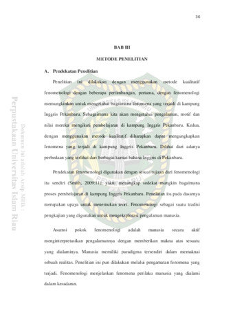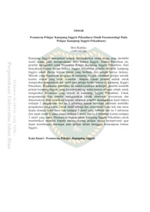 Kampung Inggris is a gathering place of people who have the main motive is to deepen the study of english. In this research, take the title of Student Phenomenon Kampung Inggris Pekanbaru. The many places of English Language course Pekanbaru researchers I chose the kampung Inggris to be researched because the system is different from the other courses. The method used by teachers in the kampung Inggris to make students interested because the system is not monotonous. The purspose of the researcher is to know the experience and motives of students when the course in the Kampung Inggris Pekanbaru. The approach of this researcher choose student of Kampung Inggris Pekanbaru which extend time of course as subject to know phenomenon that happened in kampung Inggris Pekanbaru. For data collecting researchers using observation techniques, interviews and documentation. From the research to the informant research get the result that there are 2 experiences from the 5 informants because some informants have the same experience. For the motif is divided into two motifs of the past and the future where the motive of the past there are 5 different motifs from the 5 informants and for the motifs. It is suggested to the kampung Inggris to give motivation to each student interpersonally in order to built the spirit of the student in digging ability of english.