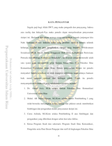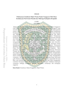 This thesis examines the Implementation of Tenggayun Coastal Tourism Object Socialization by the Cultural Tourism Office of Youth and Sports of Bengkalis Regency which is interesting to be studied, because at this time Bengkalis Regency is rich in diversity of tourism potential. The problem of this research is how Implementation of Socialization Tourism Object Coast Tenggayun By Culture Department Tourism Youth and Sports Bengkalis Regency and what are the supporting factors and socialization inhibiting factors. This study aims to find out the Implementation of Tourism Object Socialization Tenggayun By the Department of Tourism Culture Youth and Sports Bengkalis Regency. This research uses several theories of communication theory, socialization, and tourism. This research was conducted by using qualitative descriptive method through several stages of observation, interview and documentation relating to the Implementation of Socialization of the Department of Culture, Tourism Youth and Sports Bengkalis Regency. Interview conducted to three (3) staff of Tourism Office. The research was conducted at the Office of Tourism, Culture, Youth and Sports of Bengkalis Regency. The results showed that the implementation of the Socialization of Tourism Culture Youth and Sports to improve the tourism sector by holding seminars and activities meluri festivities beaches tenggayun, socialization done using media instagram and website. Provision of facilities also become one of the important in development in the area of Tenggayun Coast tourist attraction to increase tourists. There are several factors that support socialization made by Tourism Department that is Natural beautiful, attention from government of Riau Province, and attention from government of Bengkalis Regency, there are also inhibiting factor of socialization of lack of interest and awareness of local people, low of tourist visit so that lack of motivation , limited and lack of budget.