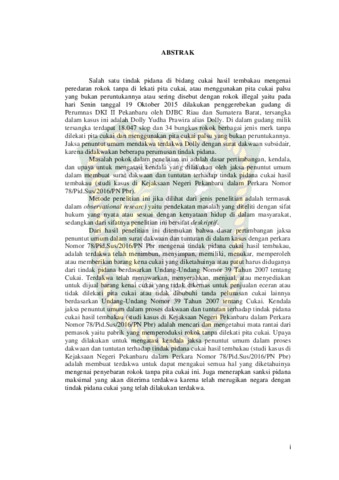 Uncontrolled Keywords: Tindak Pidana Cukai Hasil Tembakau (Studi Kasus Di Kejaksaan Negeri Pekanbaru Dalam Perkara Nomor 78/Pid.Sus/2016/PN Pbr)