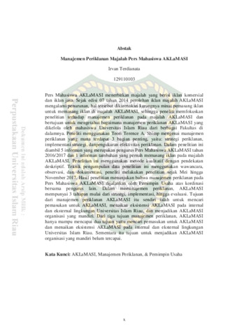 Terdianata, Irvan (2018) Manajemen Periklanan Majalah Pers Mahasiswa AKLaMASI. Other thesis, Universitas Islam Riau.