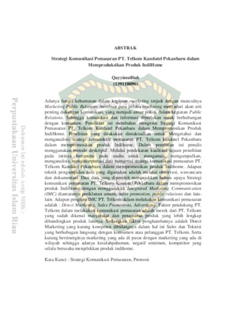 Adanya fungsi kehumasan dalam kegiatan marketing terjadi dengan munculnya Marketing Public Relations membuat para pelaku marketing menyadari akan arti penting dukungan komunikasi, yang menjadi unsur pokok dalam kegiatan Public Relations. Sehingga komunikasi dan informasi diperlukan untuk berhubungan dengan konsumen. Penelitian ini membahas mengenai Strategi Komunikasi Pemasaran PT. Telkom Kandatel Pekanbaru dalam Mempromosikan Produk IndiHome. Penelitian yang dilakukan dimaksudkan untuk Mengetahui dan menganalisis strategi komunikasi pemasaran PT. Telkom kandatel Pekanbaru dalam mempromosikan produk Indihome. Dalam penelitian ini penulis menggunakan metode deskriptif. Melalui pendekatan kualitatif tujuan penelitian pada intinya bertumpu pada usaha untuk mengamati, mengumpulkan, menganalisis, menginterpretasi data mengenai strategi komunikasi pemasaran PT. Telkom Kandatel Pekanbaru dalam mempromosikan produk Indihome. Adapun teknik pengumpulan data yang digunakan adalah melalui observasi, wawancara dan dokumentasi. Dari data yang diperoleh menunjukkan bahwa upaya Strategi komunikasi pemasaran PT. Telkom Kandatel Pekanbaru dalam mempromosikan produk IndiHome dengan menggunakan Integrated Marketing Communication (IMC) diantaranya periklanan umum, sales promotion, public relations dan lainlain. Adapun program IMC PT. Telkom dalam melakukan komunikasi pemasaran adalah : Direct Marketing, Sales Promotions, Advertising. Faktor pendukung PT. Telkom dalam melakukan komunikasi pemasaran adalah merek dari PT. Telkom yang sudah dikenal masyarakat dan penawaran produk yang lebih lengkap dibandingkan produk lainnya. Sedangkan faktor penghambatnya adalah Direct Marketing yang kurang kompeten dibidangnya dalam hal ini Sales dan Teknisi yang berhubugan langsung dengan konsumen atau pelanggan PT. Telkom. Serta kurang bersinerginya marketing yang ada di pusat dengan marketing yang ada di wilayah sehingga adanya kesalahpahaman, negatif sentimen, kompetitor yang selalu berusaha menjelekkan produk indihome.