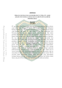 PT. agro abadi Unit II Desa Lubuk siam merupakan perusahaan perseroan terbatas yang berdiri sejak Tanggal 25 Agustus 2008 di Desa Lubuk Siam Kabupaten Kampar Propinsi Riau. Penelitian ini bertujuan untuk mengetahui peranan humas yang dilakukan oleh humas PT. Agro Abadi Unit II dalam membangun citra Perusahaan melalui kegiatan tanggung jawab sosial Perusahaan. Data dalam penelitian ini diperoleh melalui wawancara mendalam dengan tiga informan yaitu Bapak Julius sebagai Kepala Humas, Bapak Windra Sebagai pengawas lapangan, Ibu Ayu sebagai Sekretaris Humas dan Bapak Sugiono perwakilan dari masyarakat Desa Lubuk Siam. Metode penelitian yang digunakan yaitu metode penelitian deskriptif kualitatif. Berdasarkan hasil dari penelitian dan data-data yang diperoleh, maka diperoleh hasil sebagai berikut: (1) pelaksanaan tanggung jawab sosial PT. Agro Abadi Unit II secara umum sudah dilaksanakan. Berdasarkan ketentuan peraturan pemerintah Nomor 47 Tahun 2012 tentang tanggung jawab sosial dan lingkungan Perseroan Terbatas sebagai peraturan pelaksanaannya. Tanggung jawab sosial Perusahaan PT. Agro Abadi Unit II secara keseluruhan telah memberikan pengaruh positif bagi masyarakat, baik itu masyarakat di sekitar daerah Perusahaan beroperasi maupun secara umum. Hal ini terwujud dalam peningkatan kualitas hidup masyarakat yang mencangkup berbagai bidang antara lain: kesehatan, linkungan, pendidikan dan fasilitas umum lainya yang ada di Desa Lubuk Siam di perhatikan oleh pihak perusahaan.