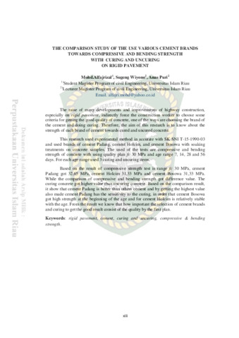 Alfajrizal, Mohd (2018) KajianPerbandinganPada Penggunaan Berbagai Merek Semen Terhadap Sampel Kuat Tekan Dan Kuat Lentur Beton Dengan Perawatan(Curing)Dan Tanpa Perawatan Pada Perkerasan Kaku(Rigid Pavement). Other thesis, Universitas Islam Riau.