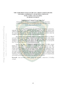 The raise of many developments and improvements of highway construction,especially on rigid pavement, indirectly force the construction worker to choose some criteria for getting the good quality of concrete, one of the ways are choosing the brand of thecement and doing curing. Therefore, the aim of this research is to know about the strength of each brand of cement towards cured and uncured concrete. This research used experimental method in accurate with SK SNI T-15-1990-03 and used brands fcementPadang,cementHolcim, andcementBosowa with soaking treatments on concrete samples. The used of the tests are compressive and bending strength of concrete with using quality plan fc30 MPa and age range 7, 14, 28 and 56 days. For each age range used 3 curingand uncuringitems. Based on the result of compressive strength test is range fc30 MPa,cement Padang got 32,65 MPa,cement Holcim 31,33 MPa and cement Bosowa 31,33 MPa. While the comparison of compressive and bending strength got ifference value. The curingconcrete got higher value than ncuringconcrete. Based on the comparison result,it show that cementPadang is better than others cement and by getting the highest value also madecementPadang has the sensitivity to the curing, in order that cementBosowa got high strength at the beginning of the age and forcementHolcim is relatively stable with the age. From the result we know that how important the selection of cement brands and curing to get the good result consist of the quality by the first plan.