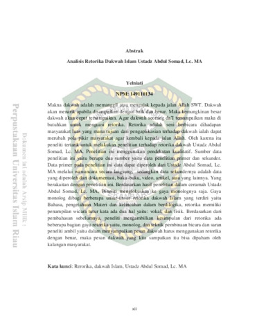Yelniati, Yelniati (2018) Analisis Retorika Dakwah Islam Ustadz Abdul Somad, Lc. MA. Other thesis, Universitas Islam Riau.