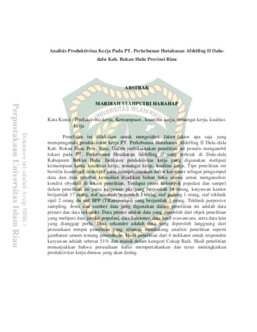 Harahap, Mardiah Syahputri (2018) Analisis Produktivitas Kerja Pada PT. Perkebunan Hutahaean Afdelling II Daludalu Kab. Rokan Hulu Provinsi Riau. Other thesis, Universitas Islam Riau.