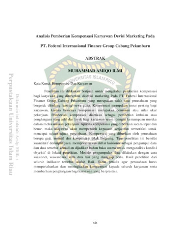 Ilmi, Muhammad Almiqo (2018) Analisis Pemberian Kompensasi Karyawan Devisi Marketing Pada PT. Federal Internasional Finance Group Cabang Pekanbaru. Other thesis, Universitas Islam Riau.