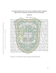 Kinerja keuangan perusahaan merupakan suatu gambaran tentang kondisi keuangan suatu perusahaan yang dianalisis dengan alat-alat analisis keuangan, sehingga dapat diketahui mengenai baik buruknya keadaan keuangan suatu perusahaan yang mencerminkan prestasi kerja dalam periode tertentu. Kinerja keuangan yang baik dapat dinilai dari hasil analisis yang memperoleh persentase yang sesuai dengan standar yang telah ditetapkan. Pedoman yang dipakai dalam mengukur Kinerja Keuangan Koperasi ini menggunakan standar Keputusan Menteri Negara Koperasi dan Usaha Kecil dan Menengah Republik Indonesia No 96/Kep/M.KUKM/IX/2004 tentang Pedoman Standar Operasional Manajemen Koperasi Simpan Pinjam dan Unit Simpan Pinjam. Lokasi penelitian ini terletak di Koperasi Tirta Dharma Perusahaan Daerah Air Minum Kota Pekanbaru jalan Jend. Sudirman No 246 Tangkerang Pekanbaru Metode analisis data yang digunakan adalah Metode Deskriptif Kuantitatif Persentase, yaitu dengan cara menjelaskan data-data yang telah ada kemudian diolah dan menghasilkan hasil dalam bentuk persentase. Analisis rasio yang digunakan dalam mengukur Kinerja Keuangan Pada Koperasi Tirta Dharma Perusahaan Daerah Air Minum Kota Pekanbaru menggunakan Analisis Rasio Likuiditas, Solvabilitas dan Profitabilitas. Keseluruhan Analisis Rasio yang dilakukan menghasilkan angka Rasio yang Cukup Baik. Walaupun ada beberapa yang masuk dalam Kriteria Kurang Baik. Kesimpulan yang dapat diperoleh dari Analisis dan Pembahasan diatas adalah bahwa secara keseluruhan Rasio yang diAnalisis sudah menghasilkan Angka Rasio yang cukup baik dan telah sesuai dengan standar yang telah ditetapkan. Hal yang perlu diperbaiki yaitu sebaiknya koperasi Tirta Dharma melakukan Analisis Rasio pada Tahun berikutnya.