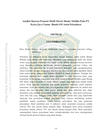 Indriatno, Uci (2018) Analisis Bauran Promosi Mobil Merek Honda Mobilio Pada PT. Kerta Jaya Utama- Honda SM Amin Pekanbaru. Other thesis, Universitas Islam Riau.