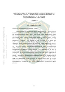 Implementation of Rokan Hulu District Regulation No. 1 of 2012 on the Submission of Government Affairs to the Village in Rokan IV Koto Sub-district is one of the governmental affairs policy given to the Village in the context of the Co-Administration in increasing the village development. Application of Village Government Affairs granted in Kecamatan Rokan IV, among others, Village Community Empowerment through Communication, Resources, Disposition and Bureaucracy Structure. The purpose of this research is to know the Implementation of Rokan Hulu District Regulation No. 1 of 2012 on the Submission of Government Affairs to the Village in Rokan IV Koto Sub-district, and to know the obstacles in Implementation of Rokan Hulu District Regulation No. 1 of 2012 onDelivery of Government Affairs to the Village in Distrits Rokan IV Koto.The results of this study are expected to provide benefits as follows: the contribution of the mind in order to develop science, especially in the field of social and political sciences as well as reference to improve the performance of village heads in carrying out government affairs given to the village.The results of the implementation of Implementation of Regional Regulation of Rokan Hulu Regency Number 1 Year 2012 on the Submission of Government Affairs to the Village in Rokan IV Koto Sub-district through four indicators are in the word gori "Pretty Good" with the value of 29 Respondents or 58%.However the authors suggest that the Village Administration can carry out the affairs of the government well and the establishment of cooperation with village communities in the Rokan IV Koto District.