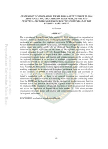 The regulation of Bupati Rokan Hulu number 29, 2016 about position, organization structure, duties and function and working procedures the secretariat of the regional parliament are guidelines for employees secretariat DPRD performing daily tasks. Research methods is kualitatif methods that can produce descriptive data in the form written words and verbal words who are observed. Seen From the process of the formation of bupati regulation are the work of the regional organizing team of regional apparatus formed in 2016 by Bupati Rokan Hulu and relatesparties. After Evaluation for regulation of Bupati Rokan Hulu Number 29, 2016 about position, organization structure, duties and function and working procedures the secretariat of the regional parliament it is necessary to evaluate irregularities for revised. The elements to revised are secretariat DPRD position, organisation structure and duties and organisation function. To conducta an evaluation for regulation of Bupati Rokan Hulu Number 29, 2016 about position, organization structure, duties and function and working procedures the secretariat of the regional parliament there are several efforts of the secretary of DPRD to form internal evaluation team and assement of organizational performance. from the evaluation there are some problems in the bupati’s rugulation such as there is no general provision on operational and administrative responsibilities so it is confusing when there are two conflicting orders from the DRPD and the bupati rokan hulu.the existance of similar tasks and function between humas and protokol DPRD by the regional secretariat humas so it needs to be emphasized the boundaries of task and functions of each organizational structure and revise the regulation of Bupati Rokan Hulu number 29, 2016 about position, organization structure, duties and function and working procedures the secretariat of the regional parliament.