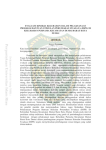 Penelitian ini bertujuan untuk mengetahui dan menjelaskan pelaksanaan Tugas Kelurahan Dalam Program Bantuan Stimulan Perumahan Swadaya (BSPS) Di Kurahan Purnama Kecamatan Dumai Barat Kota Dumai.Indikator penilaian evaluasi yang dipergunakan meliputi efektifitas, efisiensi, adequacy / kecukupan, equity /pemerataan, responsivness, dan, appropriateness / ketepatgunaan. Tipe penelitian yang berlokasi di Kantor Kelurahan Purnama Kecamatan Dumai Barat Kota Dumai ini adalah survey deskriptif, yaitu memperioritaskan daftar kuisioner sebagai alat pengumpulan data dan data yang terkumpul dengan alat ini kemudian dijadikan bahan baku utama untuk mengevaluasi kondisi empiris dari obyektivitas keberadaan tujuan penelitian pada lokasi teliti. Terdapat tiga kelompok populasi dan sampel pada penelitian ini yaitu pegawai, berjumlah 2 orang, kelurahan 1 orang, dan masyarakat jumlahnya 89 orang. Masyarakat dalam hal ini adalah mereka yang menerima bantuan BSPS. besaran sampel yang ditetapkan dari ketiga kelompok pupulasi ini adalah 2, 1, dan 44 orang. Dua teknik sampling yang dipergunakan dalam menetapkan individu sampel adalah teknik sensus untuk populasi pegawai dan kelurahan, dan teknik insidental sampling untuk kelompok populasi masyarakat. Jenis dan teknik pengumpulan data yang dipergunakan terdiri dari, data primer dikumpulkan dengan menggunakan teknik daftar kuisioner dan wawancara serta data skunder yang dikumpulkan menggunakan teknik observasi. Sementara teknik analisis data yang dipergunakan adalah dengan mempergunakan alat bantu tabel frekuensi. Berdasarkan teknik evaluasi ini peneliti menilai dan menyimpulkan bahwa tugas Kelurahan Dalam Pelaksanaan Program Bantuan Stimulan Perumahan Swadaya (BSPS) Di Kelurahan Purnama Kecamatan Dumai Barat Kota Dumai berada pada interval penilaian cukup terlaksana. Rekomendasi yang perlu di pertimbangkan terutama berkenaan dengan pelaksanaan tugas Kelurahan Purnama Kecamatan Dumai Barat Kota Dumai dalam pembangunan program Bantuan Stimulan Perumahan Swadaya (BSPS) segera menyelesaikan pembangunan sesuai dengan yang sudah direncanakan.