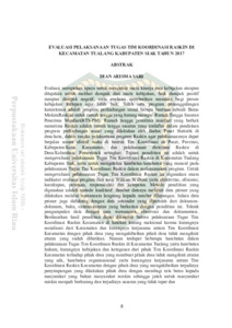 Evaluation is an effort to measure a peformance or policy or is intended to see the impact of policy, both positive and negative impacts and evaluation provides input for future policy processes to be better. One of the poverty reduction program in the form of assstance for poor rice subsidies (Raskin) for under privileged households/target households beneficiaries (RTS-PM). The beneficiary households that are entitled to roceive Raskin are the target household registered in the data collection of social protection programs carried out by the central bureau of statistics in the village/city, in the context of implementing the Raskin program so that the implementation can run effectively, in the form of coordination teams in the center, province, district/city, sub district and the implementation of Raskin distribution on the village/village/government level. The purpose of this stuy was to evaluate the implementation of the Raskin coordination teams tasks in Tualang sub district, siak district and to find out to obstacles that arose during the implementation of the Raskin coordination teams task implementing the program. To evaluate the implementation of the Raskin coordination teams task, six program evaluation indicators were used fro William N Dunn theory of effectiveness, effciency, adequacy, leveling, responsiveness and accuary. The research method. the data source in the field. In addition to primary data is also supported by secondary data obtained from documents, books, records relatng to this research. Data collection techniques by means of interview, observation and documentation. Based of the results of the studi it can be seen that the implementation of the Raskin district coordination teams tasks was said to be lass than optimal due to the lack of socialization form subdistrict and the lack of collaboration between the subdistrict coordination team and the village which resulted in the village not following the rules that had been given however, there were some obtacles to the implementation of the Raskin coordination tasks in sub district, namely legal barriers, lack of policy and firmness of the district Raskin coordination teams the village, which prevented the village from following, existing rules and organzational barriers, namely the lack of collaboration between the Raskin subdistrict coordination team with the village which resulted in irregularities by the village by dividing the rice equally among the people who were not poor so that the allocation for the poor became reduced and inappropriate targets occured. Distributive barriers that are distributive barriers, Raskin is not distributed according to the regulations, once a month, sometimes Raskin is distributed every two or three months. The amount of Raskin distributed to the community is also not in accordance with the regulations that the poor should get 15 kg of rice / KK.