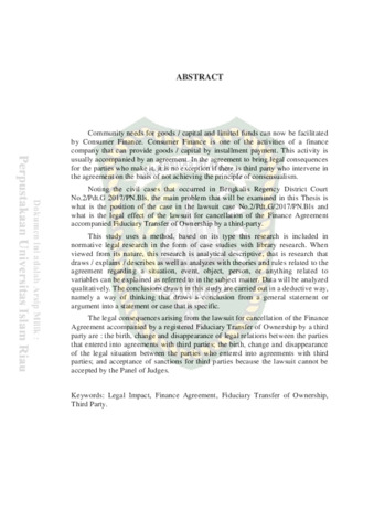 Community needs for goods / capital and limited funds can now be facilitated by Consumer Finance. Consumer Finance is one of the activities of a finance company that can provide goods / capital by installment payment. This activity is usually accompanied by an agreement. In the agreement to bring legal consequences for the parties who make it, it is no exception if there is third party who intervene in the agreement on the basis of not achieving the principle of consensualism. Noting the civil cases that occurred in Bengkalis Regency District Court No.2/Pdt.G 2017/PN.Bls, the main problem that will be examined in this Thesis is what is the position of the case in the lawsuit case No.2/Pdt.G/2017/PN.Bls and what is the legal effect of the lawsuit for cancellation of the Finance Agreement accompanied Fiduciary Transfer of Ownership by a third-party. This study uses a method, based on its type this research is included in normative legal research in the form of case studies with library research. When viewed from its nature, this research is analytical descriptive, that is research that draws / explains / describes as well as analyzes with theories and rules related to the agreement regarding a situation, event, object, person, or anything related to variables can be explained as referred to in the subject matter. Data will be analyzed qualitatively. The conclusions drawn in this study are carried out in a deductive way, namely a way of thinking that draws a conclusion from a general statement or argument into a statement or case that is specific. The legal consequences arising from the lawsuit for cancellation of the Finance Agreement accompanied by a registered Fiduciary Transfer of Ownership by a third party are : the birth, change and disappearance of legal relations between the parties that entered into agreements with third parties; the birth, change and disappearance of the legal situation between the parties who entered into agreements with third parties; and acceptance of sanctions for third parties because the lawsuit cannot be accepted by the Panel of Judges.
