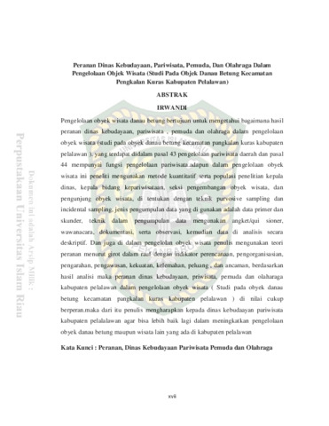 Irwandi, Irwandi (2018) Peranan Dinas Kebudayaan, Pariwisata, Pemuda, Dan Olahraga Dalam Pengelolaan Objek Wisata (Studi Pada Objek Danau Betung Kecamatan Pengkalan Kuras Kabupaten Pelalawan). Other thesis, Universitas Islam Riau.