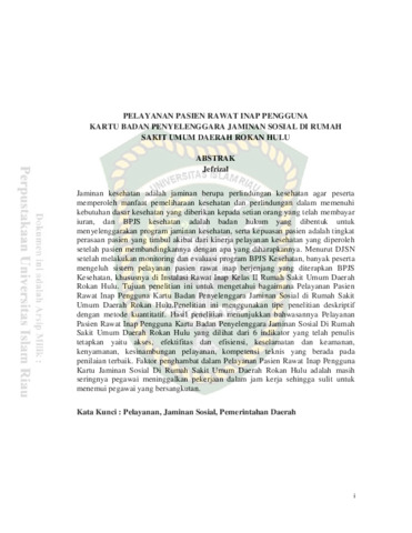 Jefrizal, Jefrizal (2018) Pelayanan Pasien Rawat Inap Pengguna Kartu Badan Penyelenggara Jaminan Sosial Di Rumah Sakit Umum Daerah Rokan Hulu. Other thesis, Universitas Islam Riau.