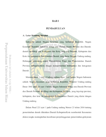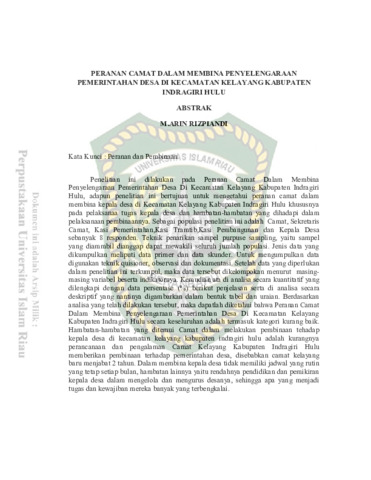 Rizpiandi, M.Arin (2018) Peranan Camat Dalam Membina Penyelengaraan Pemerintahan Desa Di Kecamatan Kelayang Kabupaten Indragiri Hulu. Other thesis, Universitas Islam Riau.