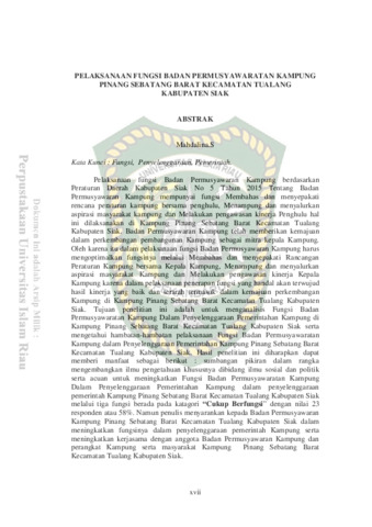 Pelaksanaan fungsi Badan Permusyawaran Kampung berdasarkan Peraturan Daerah Kabupaten Siak No 5 Tahun 2015 Tentang Badan Permusyawaran Kampung mempunyai fungsi Membahas dan menyepakati rencana peraturan kampung bersama penghulu, Menampung dan menyalurkan aspirasi masyarakat kampung dan Melakukan pengawasan kinerja Penghulu hal ini dilaksanakan di Kampung Pinang Sebatang Barat Kecamatan Tualang Kabupaten Siak. Badan Permusyawaran Kampung telah memberikan kemajuan dalam perkembangan pembangunan Kampung sebagai mitra kepala Kampung. Oleh karena itu dalam pelaksanaan fungsi Badan Permusyawaran Kampung harus mengoptimalkan fungsinya melalui Membahas dan menyepakati Rancangan Peraturan Kampung bersama Kepala Kampung, Menampung dan menyalurkan aspirasi masyarakat Kampung dan Melakukan pengawasan kinerja Kepala Kampung karena dalam pelaksanaan penerapan fungsi yang handal akan terwujud hasil kinerja yang baik dan terarah termasuk dalam kemajuan perkembangan Kampung di Kampung Pinang Sebatang Barat Kecamatan Tualang Kabupaten Siak. Tujuan penelitian ini adalah untuk menganalisis Fungsi Badan Permusyawaratan Kampung Dalam Penyelenggaraan Pemerintahan Kampung di Kampung Pinang Sebatang Barat Kecamatan Tualang Kabupaten Siak serta mengetahui hambatan-hambatan pelaksanaan Fungsi Badan Permusyawaratan Kampung dalam Penyelenggaraan Pemerintahan Kampung Pinang Sebatang Barat Kecamatan Tualang Kabupaten Siak. Hasil penelitian ini diharapkan dapat memberi manfaat sebagai berikut : sumbangan pikiran dalam rangka mengembangkan ilmu pengetahuan khususnya dibidang ilmu sosial dan politik serta acuan untuk meningkatkan Fungsi Badan Permusyawaratan Kampung Dalam Penyelenggaraan Pemerintahan Kampung dalam penyelenggaraan pemerintah Kampung Pinang Sebatang Barat Kecamatan Tualang Kabupaten Siak melalui tiga fungsi berada pada katagori “Cukup Berfungsi” dengan nilai 23 responden atau 58%. Namun penulis menyarankan kepada Badan Permusyawaran Kampung Pinang Sebatang Barat Kecamatan Tualang Kabupaten Siak dalam meningkatkan fungsinya dalam penyelenggaraan pemerintah Kampung serta meningkatkan kerjasama dengan anggota Badan Permusyawaran Kampung dan perangkat Kampung serta masyarakat Kampung Pinang Sebatang Barat Kecamatan Tualang Kabupaten Siak.