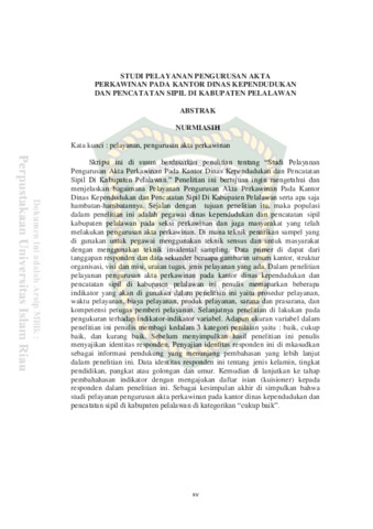 Nurmiasih, Nurmiasih (2018) Studi Pelayanan Pengurusan Akta Perkawinan Pada Kantor Dinas Kependudukan Dan Pencatatan Sipil Di Kabupaten Pelalawan. Other thesis, Universitas Islam Riau.