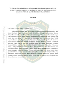 Penelitian ini bertujuan untuk mengetahui Evaluasi Pelaksanaan Fungsi Lembaga Adat dalam Membantu Tugas Pemerintah Desa Di Desa Pintu Gobang Kari Kecamatan Kuantan Tengah Kabupaten Kuantan Singingi. Penelitian ini menggunakan Metode Kuantitatif dengan Tipe penelitian Deskriptif analisis. Populasi dan sampel dalam penelitian ini yaitu, lembaga adat, kepala desa, bpd, ketua RW, ketua RT dan Masyarakat Desa Pintu Gobang Kari. Teknik pengumpulan data yang digunakan yaitu data primer dikumpulkan dengan Teknik Kuissionerdan Wawancara serta Data Skunder dikumpulkan melalui Observasi langsung kelapangan. Sementara Teknik Analisis Data yang digunakan adalah dengan alat bantu Tabel Frekuensi. Setelah dilakukan penelitian dan kemudian dianalisis, maka dapat disimpulkan Pelaksanaan Fungsi Lembaga Adat dalam Membantu Tugas Pemerintah Desa di Desa Pintu Gobang Kari Kecamatan Kuantan Tengah Kabupaten Kuantan Singing berada dalam Kategori “ Kurang Baik” dengan tanggapan responden sebanyak 23 orang atau sama dengan 35%. Karena belum adanya upaya konkrit dari Lembaga Adat Desa Pintu Gobang Kari dalam penyelesaian perselisihan yang menyangkut hukum adat istiadat dengan kebiasaan-kebiasaan masyarakat, sehingga masih terdapat masalah- masalah yang sering terjadi karena tidak ada upaya penyelesainya dan tidak ada kesadaran dari masyarakat.