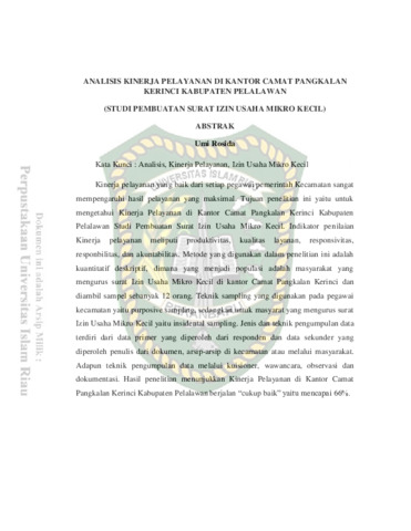 Rosida, Umi (2018) Evaluasi Pelayanan Pengurusan Akta Kelahiran Di Kantor Unit Pelaksana Teknis Kependudukan Dan Pencatatan Sipil Kecamatan Bengkalis Dan Kecamatan Bantan Kabupaten Bengkalis. Other thesis, Universitas Islam Riau.